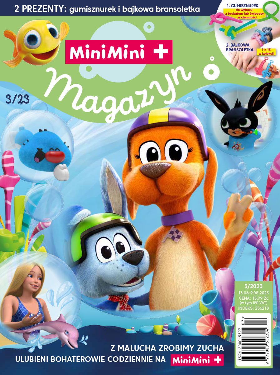 Ten numer Cię rozbawi i zaskoczy! Jest w nim, jak zwykle, wiele zabaw i zadań do wykonania! Na dobry początek Rybka MiniMini opowie Ci o przygodzie z rekinem Ryśkiem. A potem sprawdzisz, czy uważnie słuchałeś jej opowieści. Spotkasz tu się też z innymi lubianymi bohaterami kreskówek. Razem z Łapką Psiuńkiem wpadniesz w odwiedziny do Puszka. Pobawisz się też z psiakami Barbie, a potem poznasz urocze wegezaury i sprawdzisz, który bohater z kreskówki „Oggy, Oggy” może być Twoim przyjacielem. Miłej zabawy!!!